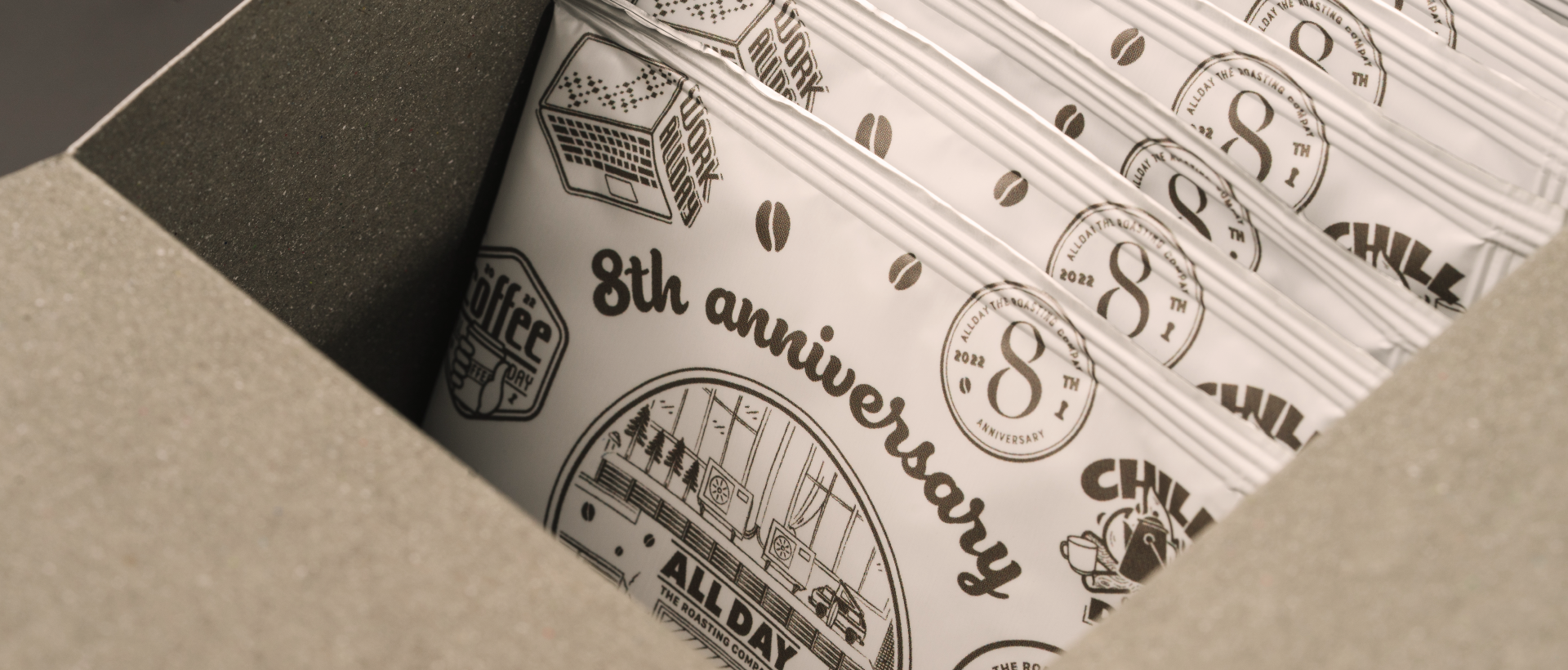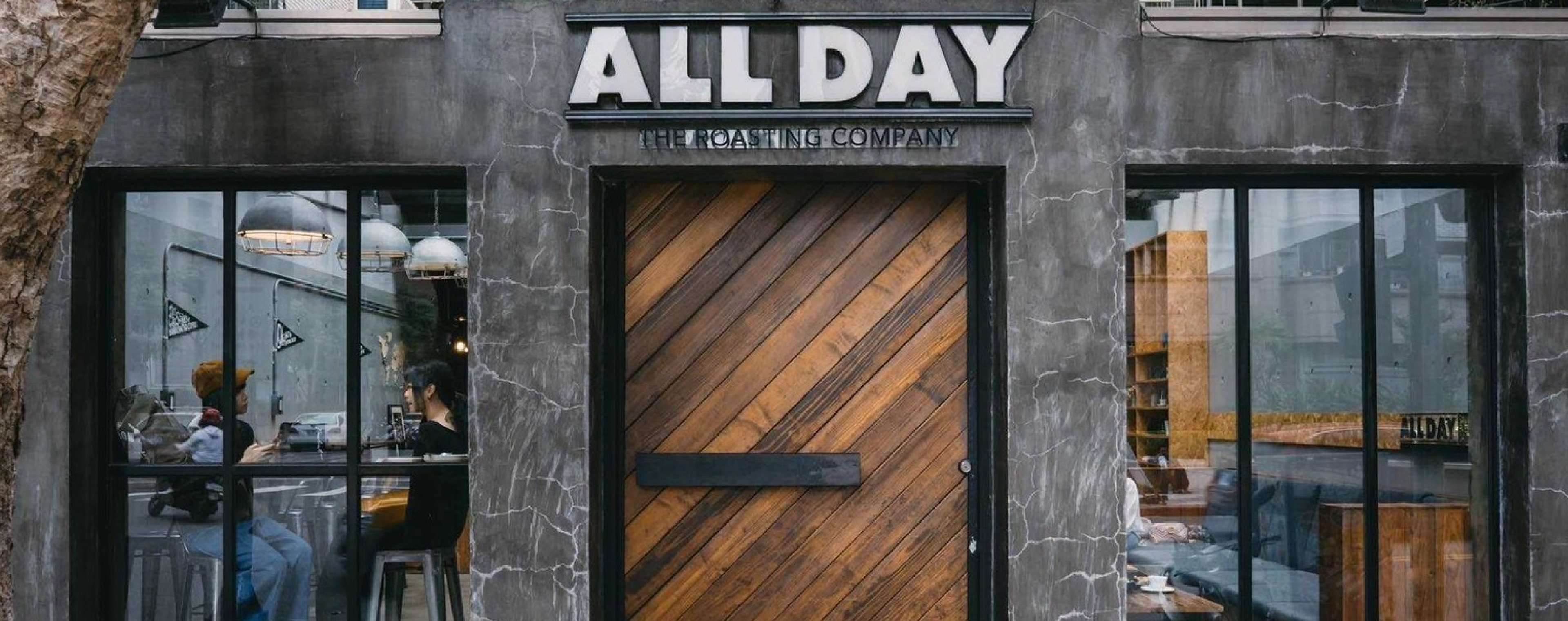 座落在靜謐的民生社區,ALL DAY ROASTING COMPANY 陪伴著人們走過八年的時光,我們以一個指標性門面作為紀念活動核心視覺,表現咖啡廳熟悉的溫暖。
