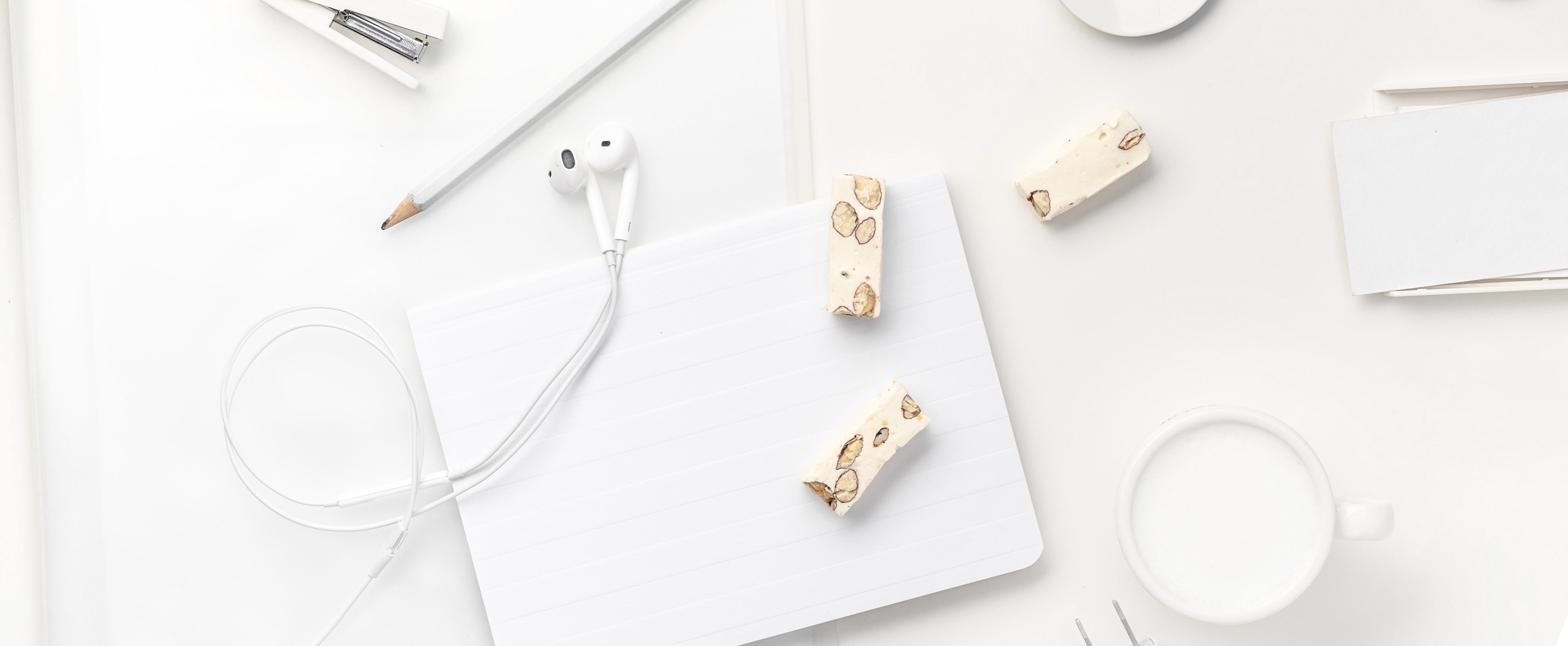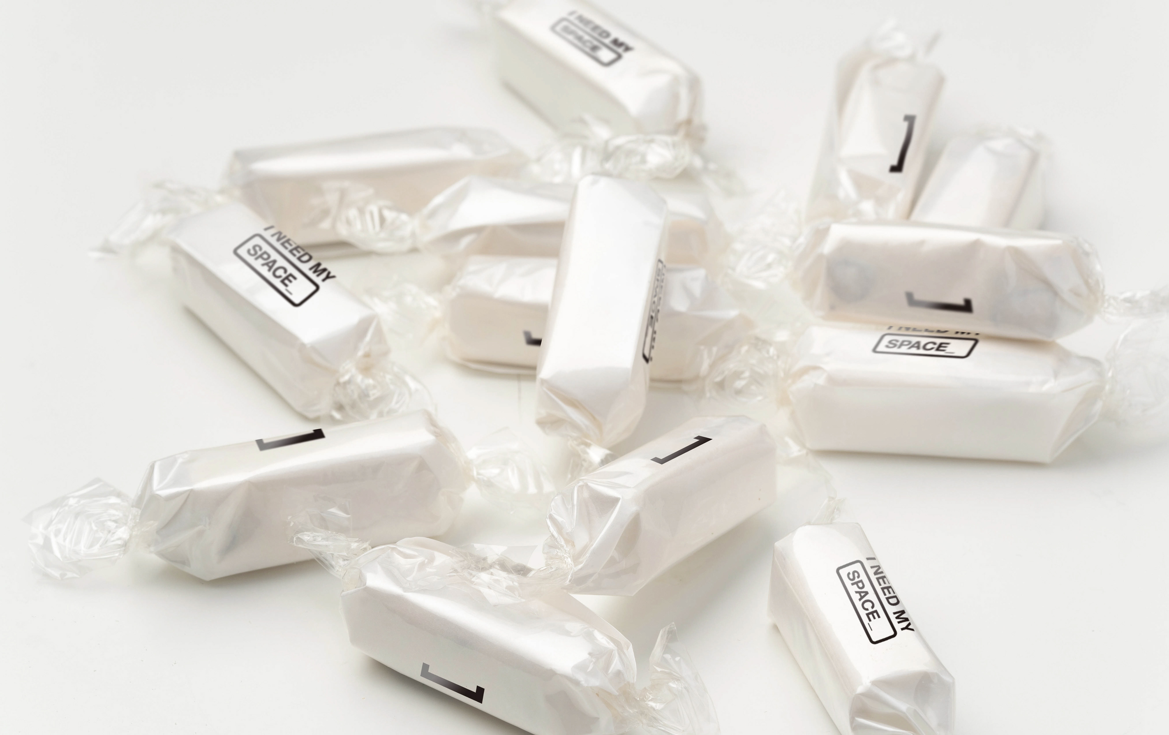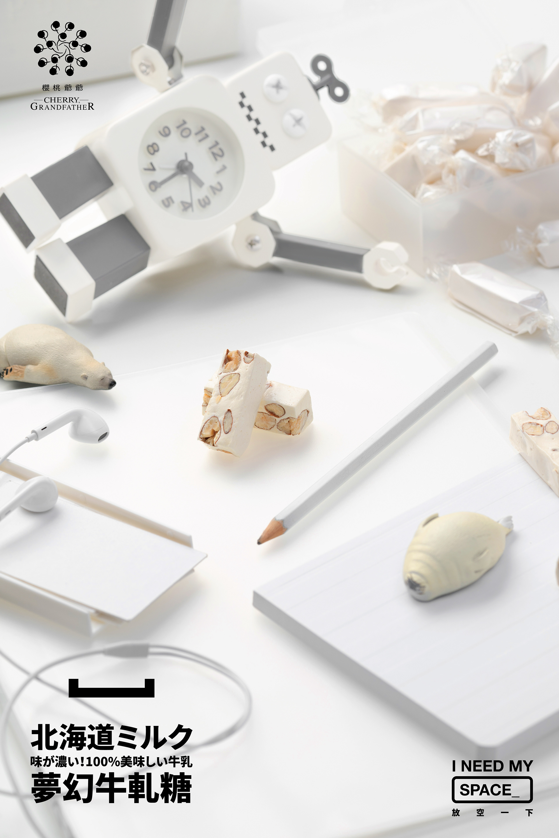 系列形象識別設計靈感來自牛軋糖的長條造型,小小一顆就像一個空白鍵SPACE_BAR,一口咬下,就像按個空白鍵放空一下,瞬間陷入北海道的漫天雪白。